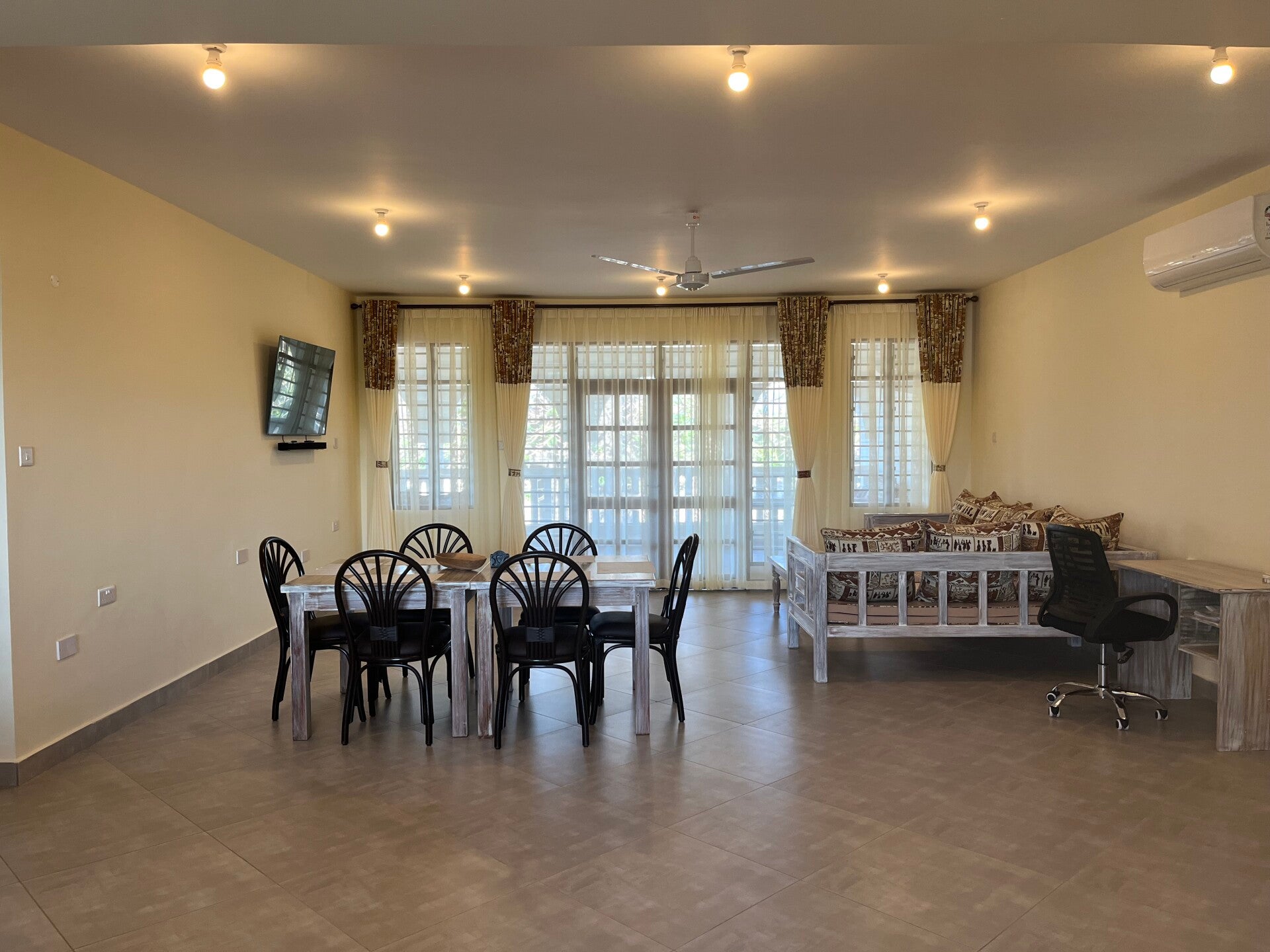 Für ein Apartment mit einem Schlafraum (eine dritte Person kann im Wohnzimmer übernachten) berechnen wir -außer Mitte Dezember bis Anfang Januar - 50€/Nacht, für ein Apartment mit zwei Schlafräumen (eine fünfte Person kann im Wohnzimmer übernachten) berechnen wir 100€/Nacht. Wollen Sie im Dezember oder länger als 29 Nächte bei uns wohnen, fordern Sie bitte bei Tamoni Homes, Diani Beach, ein Angebot an